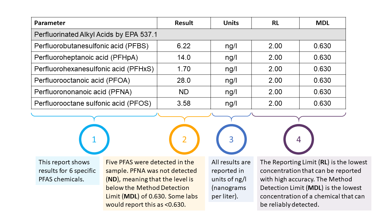 This sample water report shows results for six PFAS chemicals along with explanations of common terms used by labs.